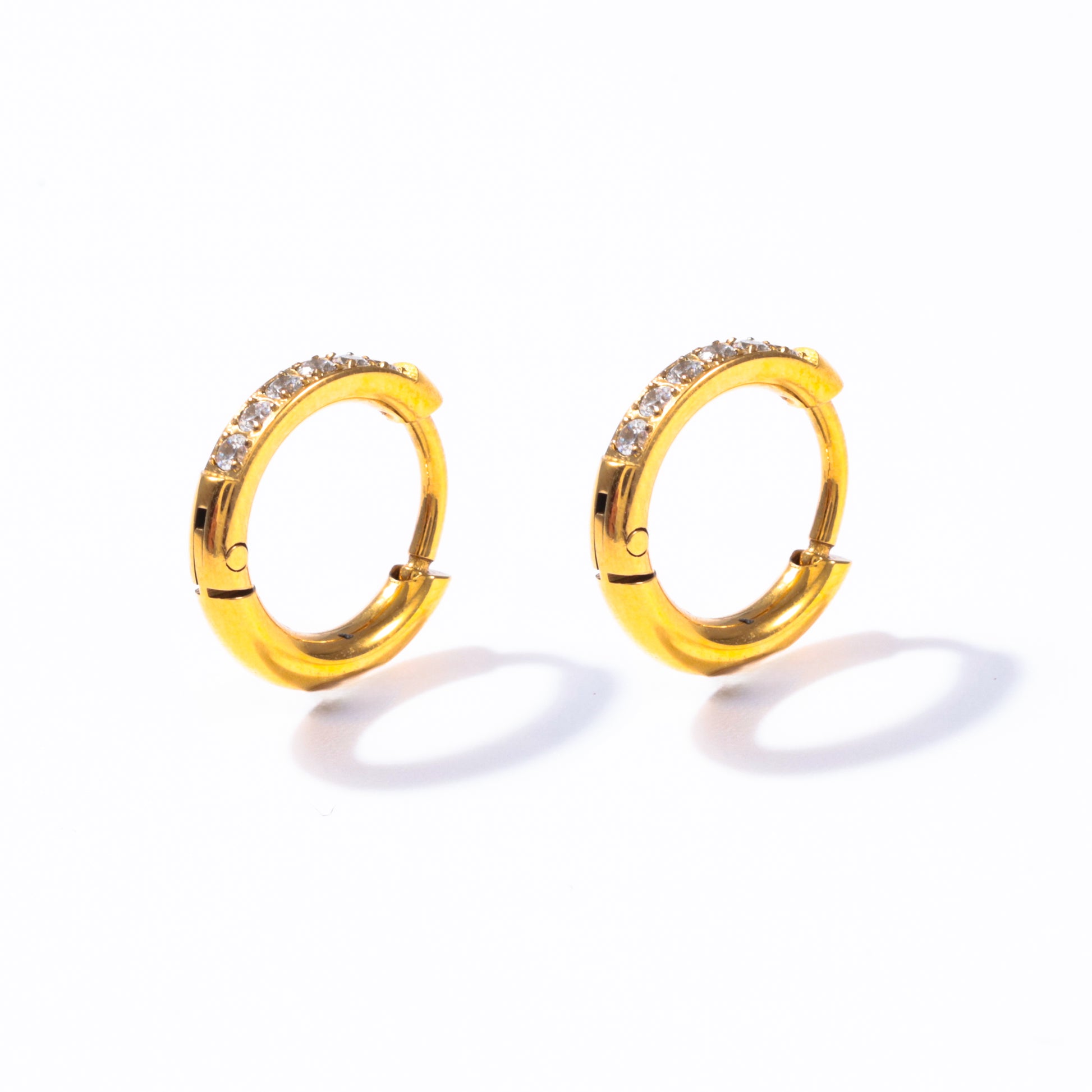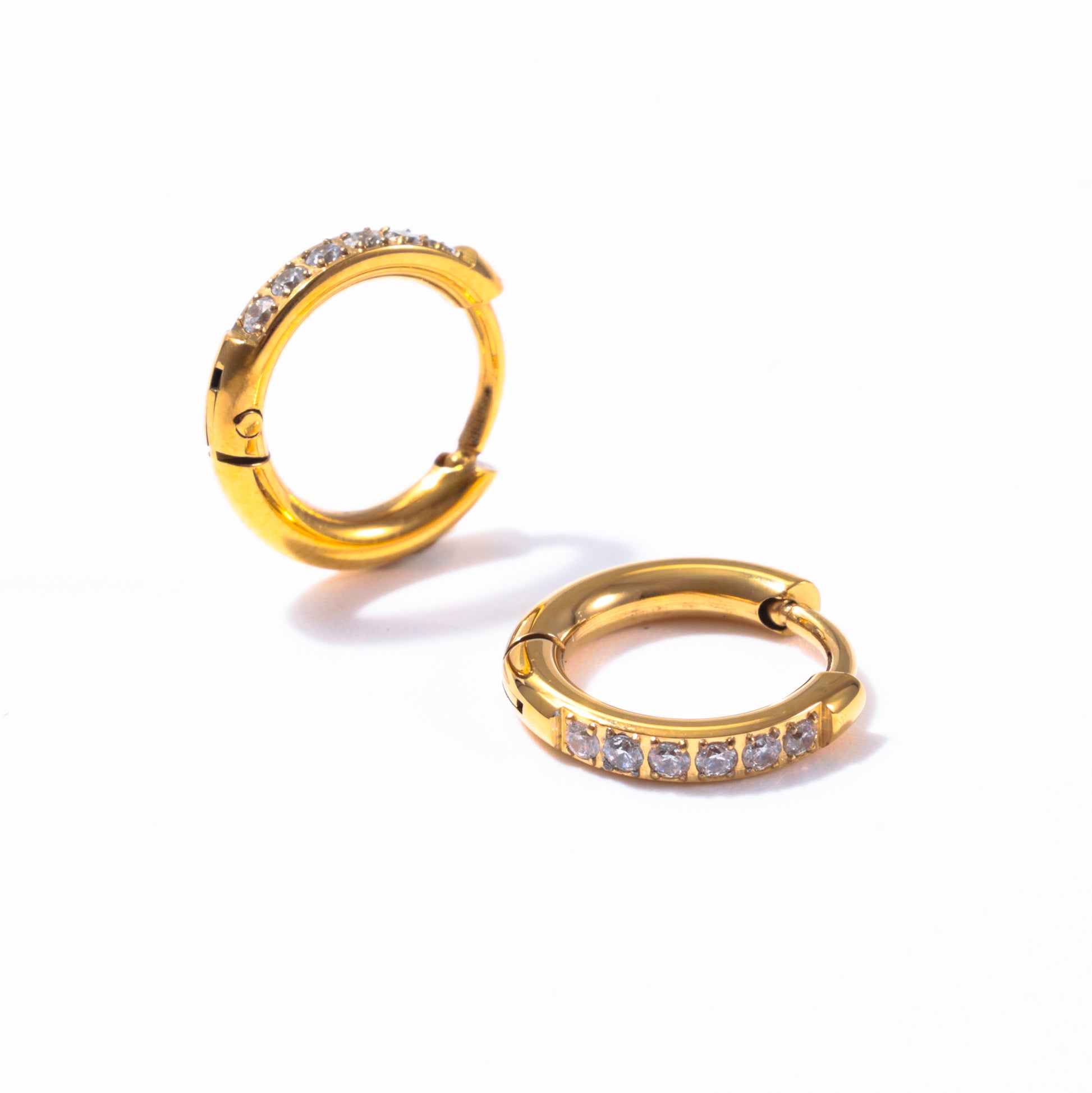 Elegant gold huggie earrings adorned with sparkling cubic zirconia stones. A timeless accessory that adds subtle sophistication to any look.